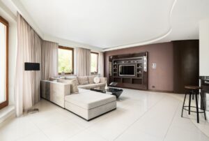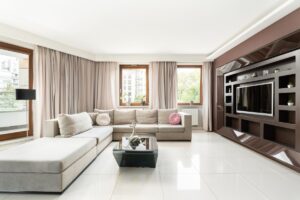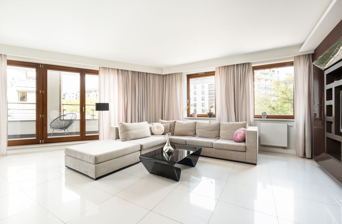 Podłogi w salonie, aneksie kuchennym, łazience z wanną oraz hallu wykończone są szkliwionym wielkoformatowym jasnym gresem wysokiej klasy, co dodaje pomieszczeniom wyjątkowego blasku i nowoczesnego charakteru.